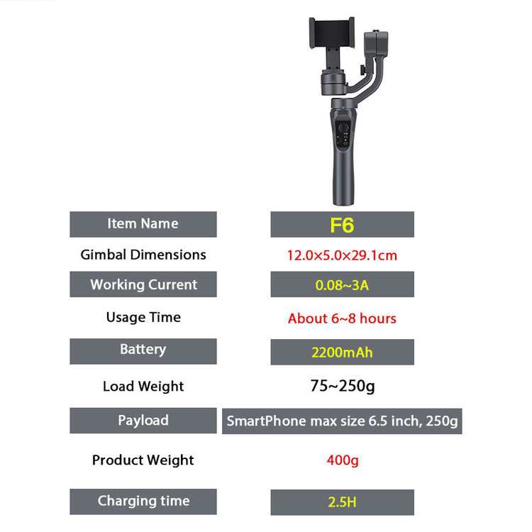 گیمبال مدل F6 یه لرزشگیر 3 محوره بسیار با کیفیت است که برای گوشی های هوشمند طراحی و ساخته است. با استفاده از این لرزشگیر می توانید عکس و ویدئو هایی بدون لرزش و تنها یا یک دست ثبت نمایید. این لرزشگیر به گونه ای طراحی شده است که گوشی های بزرگ تر را نیز بتوان بر روی آن استفاده نمود. بدنه ی این گیمبال نیز سبک و راحت طراحی شده و کنترل آن نیز بسیار راحت است. علاوه بر این می توان به کمک حرکات دست نیز این گیمبال را کنترل کرد.باتری 2200 میلی آمپر داخلی حداکثر زمانی که نیاز است تا باتری این لرزشگیر شارژ کامل شود3، 4 ساعت می باشد. بالانس کردن این لرزشگیر تنها به کمک یک دکمه بر روی بدنه صورت می گیرد.