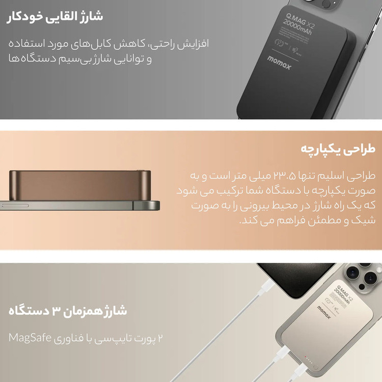 کمپانی مومکس همیشه در تلاش بوده تا محصولاتی فراتر از کیفیت و تکنولوژی جهانی خلق کند. نکته مهمی که علاوه بر زیبایی و شیک بودن محصولات برای این کمپانی بسیار حائز اهمیت میباشد؛ کارایی و کیفیت محصولات است.کمپانی مومکس با تولید کالاهایی بسیار با کیفیت توانسته جایگاه بالایی را در بازار دیجیتال اروپا و امریکا به خود قرار بدهد و رقابت بسیار نزدیکی را در میان رقبای خودش ایجاد کند.امروزه با پیشرفت تکنولوژی و استفاده بیشتر از دستگاههای هوشمند، چالشی که همه با آن سروکار داریم تمام شدن شارژ در زمانی نامناسب است و به همین جهت طراحان کمپانی مومکس پاور بانک بسیار قدرتمند وبا کیفیتی را به اسم IP133D تولید کرده این پاورک بانک دارای پورتMagnetic Wireless وPD وUSB.C در 20000mah میباشد. با این پاوربانک ظرافت خالص را تجربه کنید.این محصول آسان برای نگه داشتن با یک دست، آسان برای حمل برای شما می باشد. لبه های منحنی گرد ظریف، مفصل طبیعی و صاف، بادوام تر و ماندگارتر دارد.
