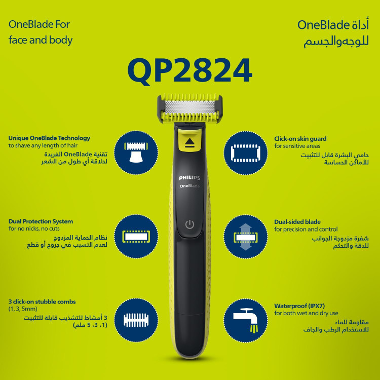 ماشین اصلاح OneBlade QP2824/10 با تیغه دوطرفه، ضدآب و سبک، اصلاح، کوتاه کردن و طراحی دقیق خط ریش را به راحتی انجام میدهد. تیغههای استیل ضدزنگ دوام بالایی دارند و محافظ پوست از خراش جلوگیری میکند. طراحی ارگونومیک، استفاده طولانی بدون خستگی را ممکن میکند و ضدآب بودن، شستشو و نگهداری دستگاه را آسان میکند. مناسب استفاده روزانه و سفر، برای مردان و خانمهایی که دنبال اصلاح دقیق و راحت هستند.