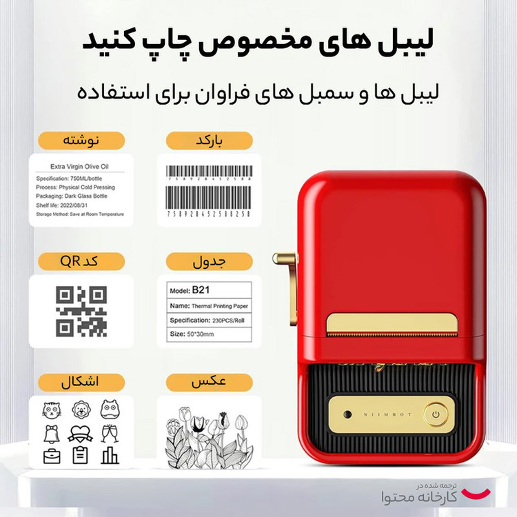 پرینتر همراه لیبل زن حرارتی و قابل حمل 2 اینچی از شرکت نیمبات مدلB21 دارای ابعاد 12 x 9 x 6 سانتیمتر و وزن آن 272 گرم است. در کنار یک دستگاه B21 میتوانید. با چاپ حرارتی این پرینتر، شما به سادگی کاغذ لیبل را پس از اتمام تعویض میکنید و دیگر نیازی به خرید جوهر، تونر یا نوار کربن ندارید! با یک بار شارژ باتری آن هم میتوانید 6 ساعت از آن استفاده کنید. این محصول پس از توقف 15 دقیقه به طور خودکار خاموش میشود تا در مصرف برق صرفهجویی شود. بدون نیاز به خرید باتری، در هزینههای چاپ خود تا 70٪ صرفهجویی کنید. با اتصال پرینتر NIIMBOT APP از طریق بلوتوث و ایجاد برچسب در APP، میتوانید کارهایی مانند تطبیق الگوهای خودکار، تشخیص تصویر و چاپ دستهای را انجام دهید. این دستگاه همچنین بیش از 20 نوع فونت و هزاران ماده تصویری دارد. علاوه بر این، میتوانید محتوا و مکان برچسبها را تنظیم کنید تا برچسبی ایجاد کنید که تمام نیازهای شما را برآورده کند.لیبل زن B21 از برچسبهای عرض 2-5 سانتیمتر پشتیبانی میکند که میتواند به طور گسترده در مواد غذایی، پزشکی، پوشاک، جواهرات، سوپرمارکت، داراییهای ثابت، تجاری، مشاغل کوچک، کارخانهها و غیره استفاده شود. این پرینتر بسیار شیک علاوه بر پرینت لیبل و رسید و برچسب موردنیاز ، میتواند زینت دهنده پیشخوان دفتر کار، مطب و ... باشد.