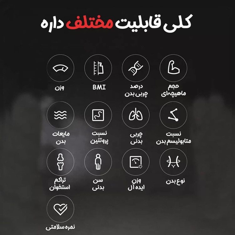 یک اندازه گیری می تواند یک گزارش تجزیه و تحلیل از چندین شاخص ترکیب بدن ایجاد کند که ترکیب بدن از جمله چربی بدن، توده عضلانی، محتوای آب، پروتئین و تراکم مواد معدنی استخوان را ارزیابی می کند. همچنین میزان چربی را ارزیابی می کند و خطرات پنهان چاقی را شناسایی می کند. تجزیه و تحلیل عمیقی از وضعیت سلامتی خود دریافت کنید تا بتوانید به سرعت و به راحتی هر گونه تغییر را شناسایی کنید.