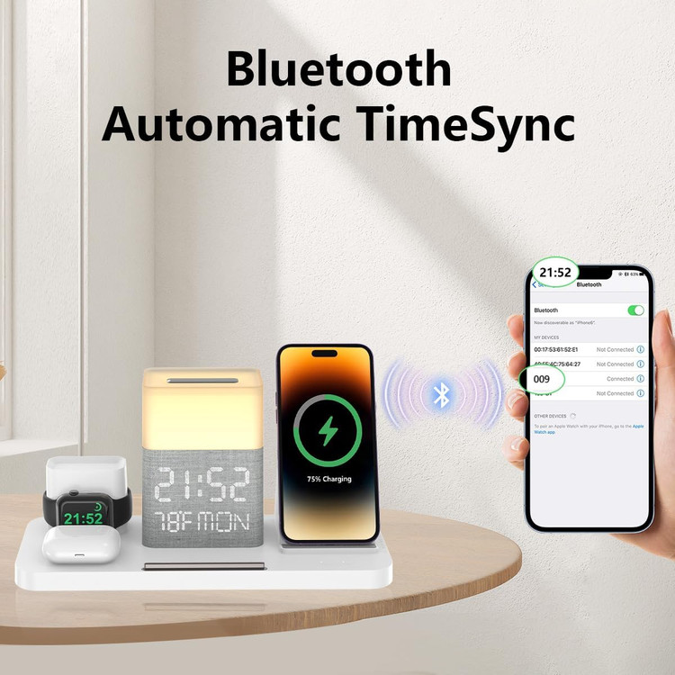 【همگام سازی خودکار زمان بلوتوث】- بزرگترین مزیت این وایرلس شارژ این است که می تواند به طور خودکار زمان را از طریق بلوتوث همگام کند. عملیات بسیار ساده است. پیوند بلوتوث را در تلفن همراه خود باز کنید و "009" را پیدا کنید. اتصال موفقیتآمیز است و میتوانید همگامسازی کنید. علاوه بر همگامسازی زمان، میتوانید روز هفته و دمای داخلی نمایش داده شده روی آن را نیز ببینید.